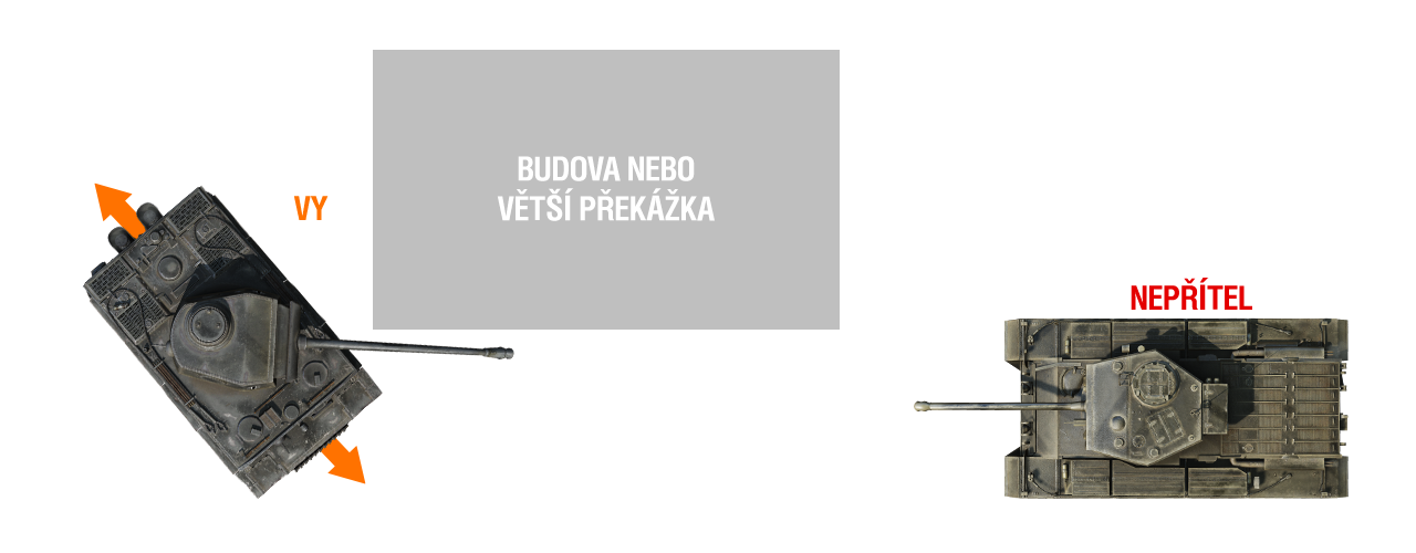 Důležité: Mějte na paměti, že tato verze manévru není vhodná pro všechny tanky. Abyste jej mohli provést, musíte mít dobré záporné hodnoty náměru děla. Proto si před provedením manévru ověřte, zda vaše vozidlo umožňuje dostatečné sklonění děla. V opačném případě riskujete vystavení korby nepříteli a v některých případech dokonce i zranitelné velmi spodní části svého vozidla.