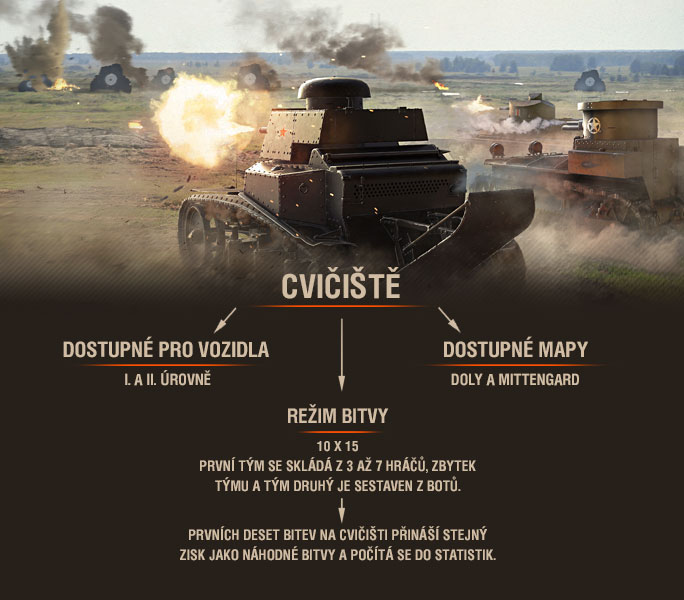 Bitvy budou probíhat ve formátu 10 vs 15. Hráčův tým bude skládat ze 3 až 7 tankistů, zbytek pak bude doplněn počítačem řízenými spoluhráči (takzvanými „boty“). V protivníkově týmu pak bude 15 botů připravených otestovat vaše schopnosti! Mrkněte se na infografiku, která vám prozradí více o tomto vzrušujícím novém módu: