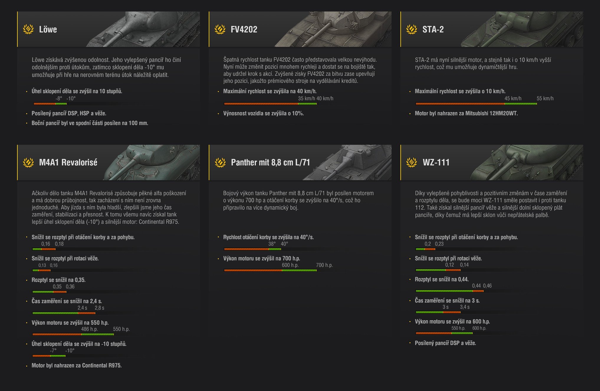 Práce na vyvážení hry je v plném proudu. A společně s celou salvou úprav, které přichází s verzí 9.17, budeme také vylepšovat bojové parametry prémiových tanků se značně nízkým výkonem. Děkujeme vám, že jste nám o nich dali hlasitě vědět! Vaše názory v kombinaci se statistikami bitev nám pomohly v dolaďování jejich vlastností.
