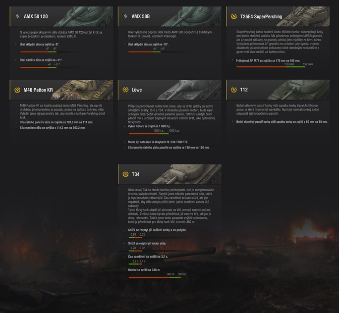Löwe získal další posílení: výkonnější motor a silnější pancíř. Navíc jsme na základě vašich názorů zlepšili bojové parametry pro další 4 další prémiová vozidla: americký T34 a T26E4 Super Pershing, M46 Patton KR, a čínský 112, a také pro dva francouzské těžké tanky: АМХ 50В a АМХ 50 120. Klikněte levým tlačítkem na níže uvedený obrázek, abyste se podívali na podrobný přehled: