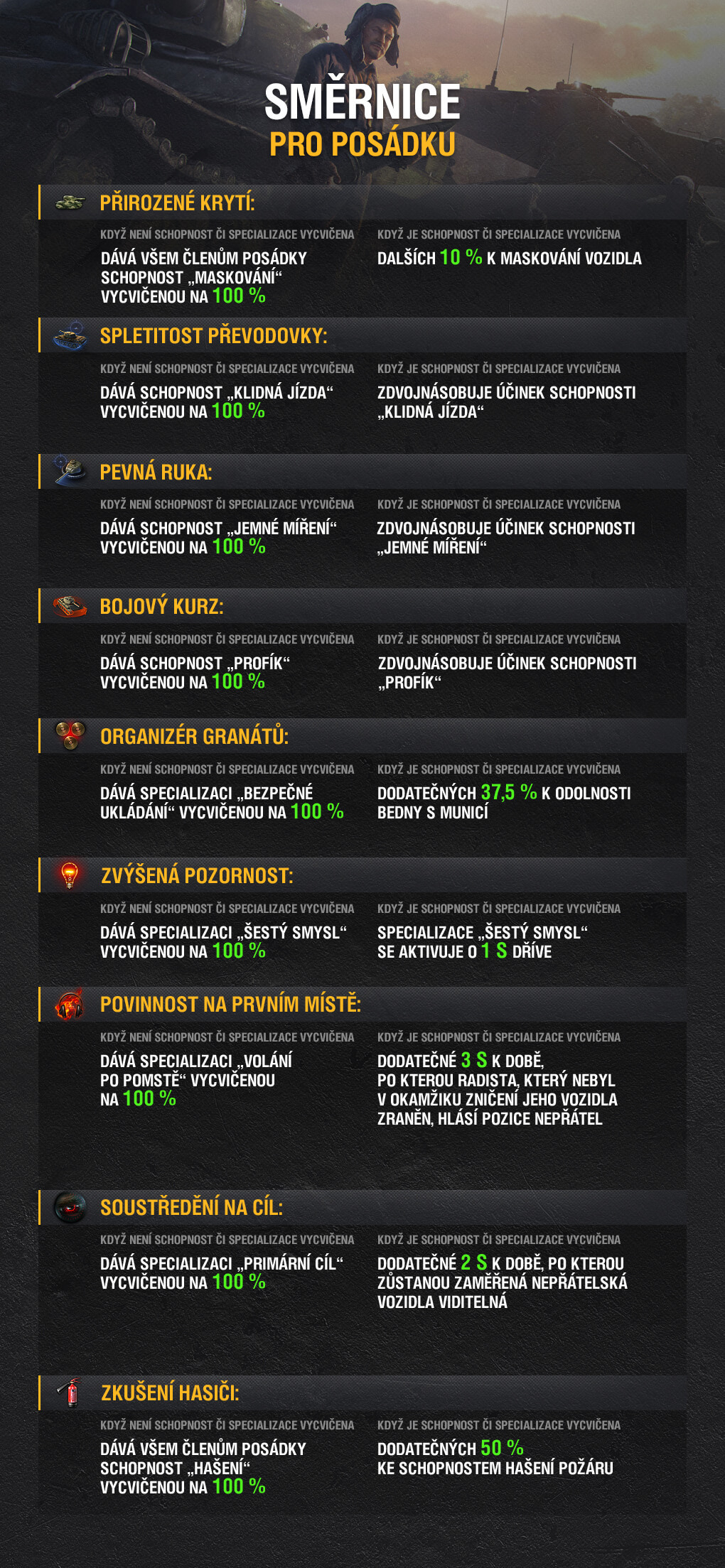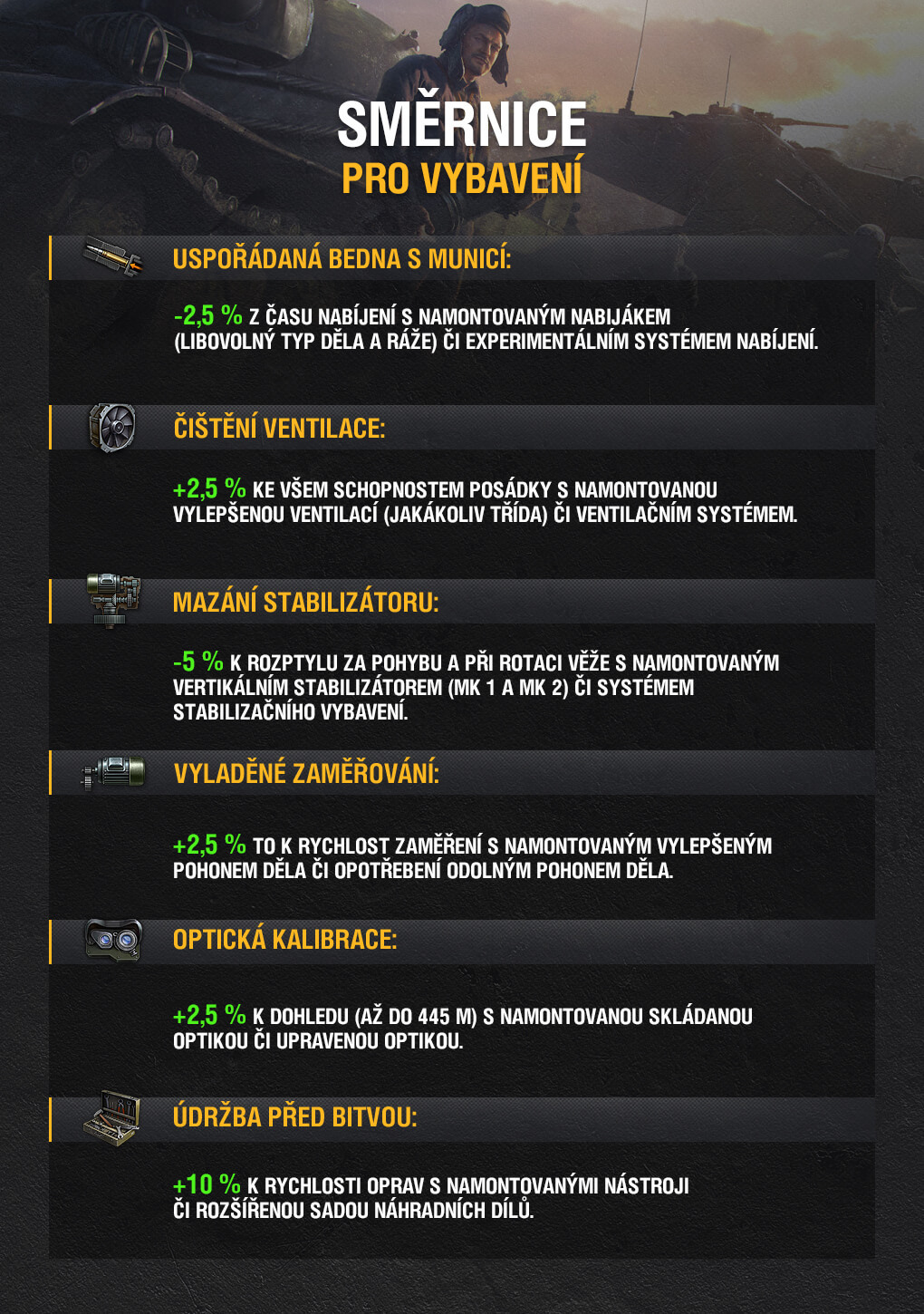 Společně s vylepšeným vybavením můžete za bony získat i speciální osobní zálohy, kterým se říká směrnice: šest pro vybavení a dalších devět pro posádku. Jakmile jsou aktivovány, účinkují po dobu jedné bitvy. V závislosti na typu mohou pozvednout bojové parametry, posílit schopnosti a specializace posádky, které jste vycvičili, nebo dočasně zapnout ty, které jste ještě nevycvičili. Směrnice pro vybavení zvyšují bonus, který parametrům vozidla přidává aktuálně namontované vybavení. Řekněme, že jste tank vybavili Nabijákem, Stabilizátorem a Skládanou optikou. Dalším krokem bude aktivace jednoho ze tří typů směrnic, které s těmito typy vybavení fungují.