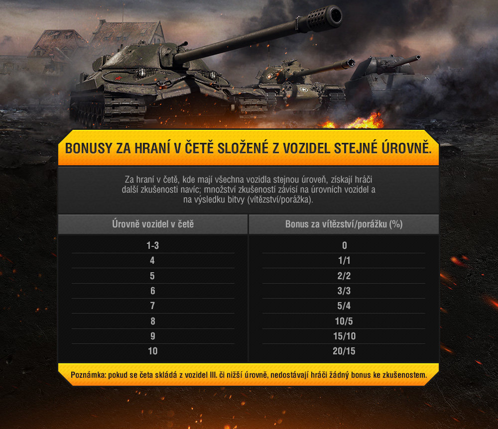 Bonus ke zkušenostem obdrží čety, které se skládají z vozidel stejné úrovně. Odměna závisí na výsledku bitvy, tedy vítězství nebo porážce, ale také úrovni vozidel v četě. Dynamické čety vytvořené během bitvy obdrží bonusy ke zkušenostem za hraní s vozidly stejné úrovně počínaje další bitvou. Pokud se hráč zapojí do dříve vytvořené čety, obdrží bonus ke zkušenostem pouze počínaje další bitvou, pokud budou v dané bitvě splněny nezbytné podmínky.