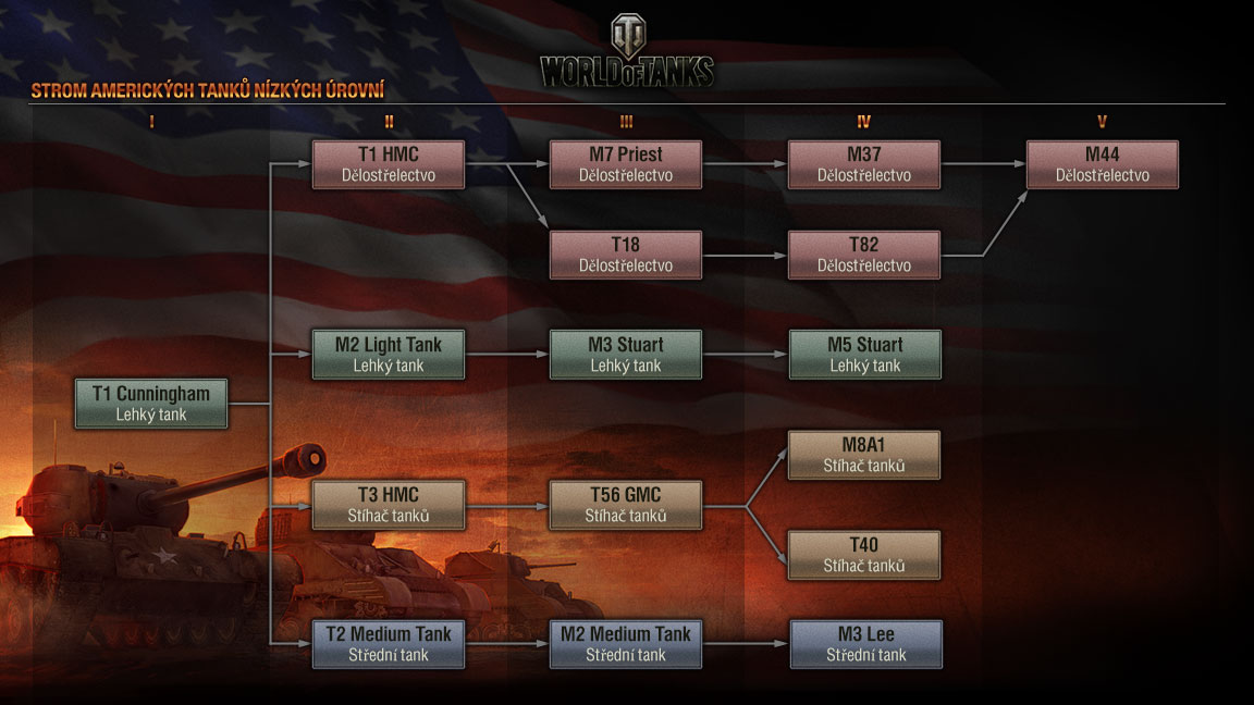 Od této aktualizace začnou platit některé změny u amerických vozidel nižších úrovní. Zároveň zde přibudou nové stroje, jiným se vyrovnají statistiky či případně změní úroveň. Nový výzkumný strom bude vypadat takto: