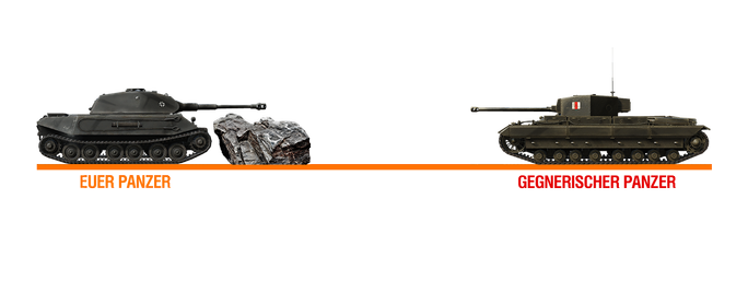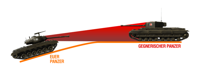 Der Geschützneigungswinkel, in diesem Fall der negative, ist das Ausmaß, in dem euer Geschütz in Richtung des Bodens gerichtet werden kann. Je höher der negative Wert, desto tiefer kann euer Geschütz geneigt werden. Ein guter negativer Geschützneigungswinkel erlaubt euch nicht nur aus höheren Positionen auf den Gegner zu zielen, sondern ermöglicht euch außerdem, Geländemerkmale wie Hügel zu benutzen, um eure Wanne zu decken und trotzdem auf den Gegner zu feuern.