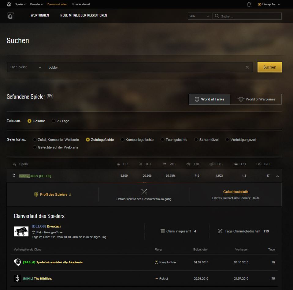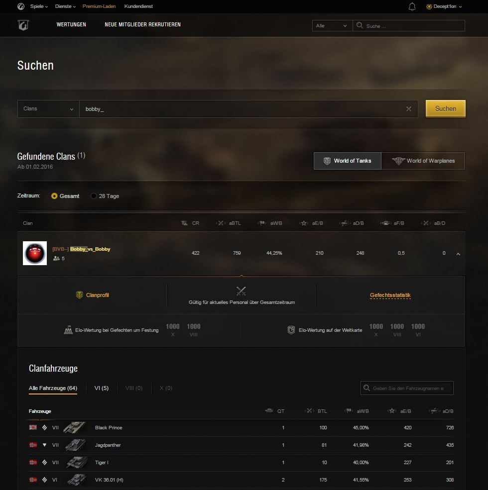 Mit mindestens zwei Zeichen kann man die Suche beginnen und erhält eine Liste der passenden Clans nebst deren wichtigsten Gefechtsstatistiken für den Gesamtzeitraum oder die letzten 28 Tage. Klickt auf einen Clan in der Liste, um noch mehr Informationen über ihn zu erhalten. Sucht ihr nach einem Clan, dann wählt einen aus der Liste aus, der euch gefällt, schreibt eine kurze Nachricht und übermittelt eure Clananmeldung.
