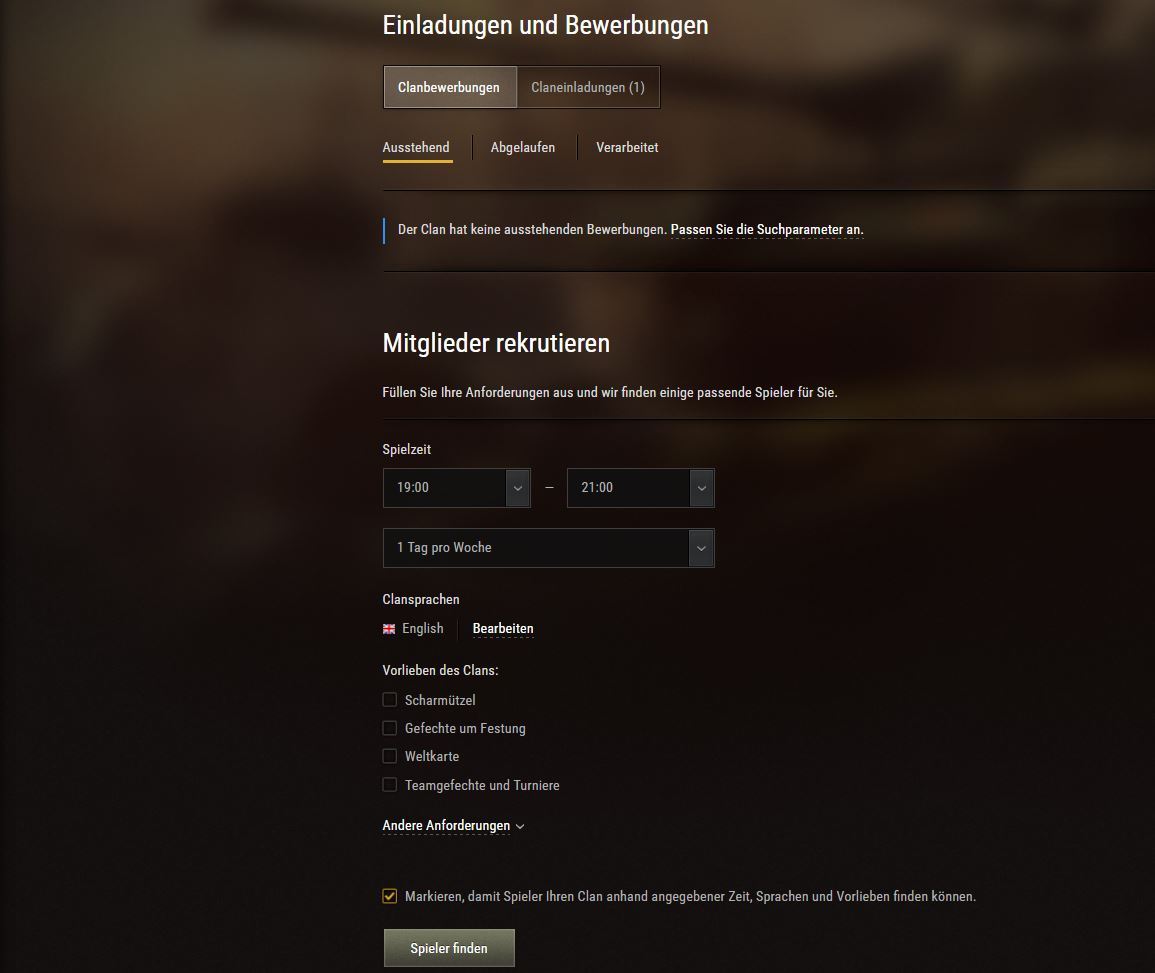 Achtung: Wegen kleineren technischen Problemen wurde die Option, neue Clanmitglieder über das Portal von World of Tanks zu rekrutieren, vorübergehend deaktiviert. Benutzt währenddessen den Bereich „Neue Mitglieder rekrutieren“ auf dem Clanportal von World of Tanks.