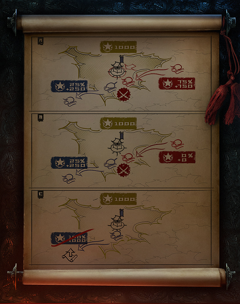 2.6. Ein Clan sammelt Ruhmpunkte in einer Provinz an, die er hält. Sobald die Provinz von einem anderen Clan erobert, werden die angesammelten Ruhmpunkte unter neuem und altem Besitzer aufgeteilt. Verliert ein Clan seine Provinz, erhält der Clan einen festen Prozentsatz der angesammelten Ruhmpunkte, der Rest geht an den neuen Besitzer.