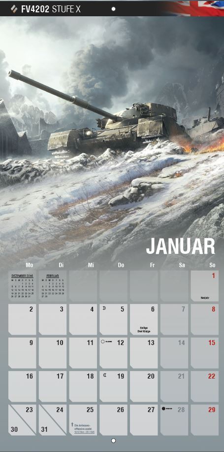 Wir haben uns mit Panini zusammengetan, um euch heute den neuen World-of-Tanks-Kalender für 2017 vorzustellen, mit atemberaubenden Hintergrundbildern, die jedes Panzerfahrerherz höher schlagen lassen. Als kleines Extra sind neben den üblichen Feiertagen auch die Daten der wichtigsten historischen Ereignisse enthalten.