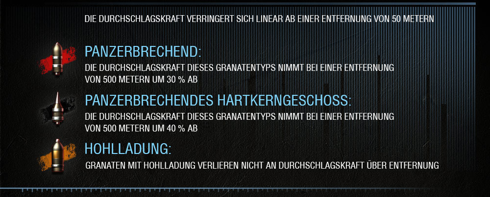 Die Durchschlagskraft nimmt abhängig von der Entfernung stärker ab, um die Bedeutung der Panzerung im Spiel zu steigern. Der Beschuss aus größerer Entfernung wird weniger effektiv – somit werden Spieler ermutigt, sich in den Nahkampf zu wagen. Sie werden sich aktiver am Kampfgeschehen beteiligen und mehr manövrieren müssen, um gegnerische Fahrzeuge beschädigen zu können.