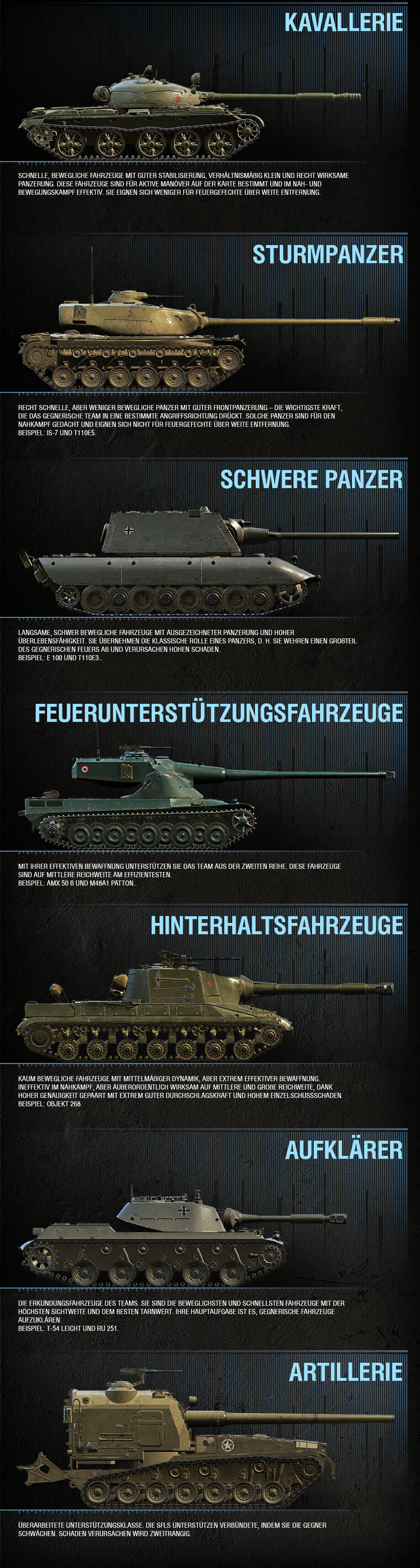 Derzeit können alle Fahrzeugtypen verschiedene Rollen einnehmen. D. h., dass Fahrzeuge jedes Typs (mit Ausnahme von Selbstfahrlafetten und einiger leichter Panzer) mehrere Rollen effektiv spielen können. Somit nutzen Spieler ähnliche Taktiken für die verschiedenen Fahrzeugtypen, wodurch das Gameplay ziemlich eintönig wird. Die unten aufgeführten Verbesserungen sollen die Fahrzeuge im Spiel entsprechend ihrer Rollen und abhängig von den jeweiligen Funktionen diversifizieren. Im Spiel wurden sieben Rollen basierend auf der Evaluierung durch Experten unterschieden. Dies sind die Rollen im Spiel, die jedes Fahrzeug spielen sollte: