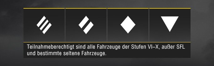 Es gibt keine Voraussetzungen für die Teilnahme, jeder hat die gleichen Chancen, die Spitze zu erklimmen und dort oben zu bleiben. Auch gibt es keine komplizierten Regeln. Die Sache ist einfach: zieht los und spielt. Ihr seid dazu eingeladen, mit nahezu jedem Fahrzeug der Stufe VI oder darüber mitzumachen, mit zwei Ausnahmen: Artillerie und einige seltene Panzer (auf der Eventseite findet ihr eine komplette Liste). Was das Format anbelangt, hier ist das Zufallsgefecht das Maß aller Dinge. Wer eingefleischte Freunde hat, darf mit ihnen zusammen im Zug kämpfen.