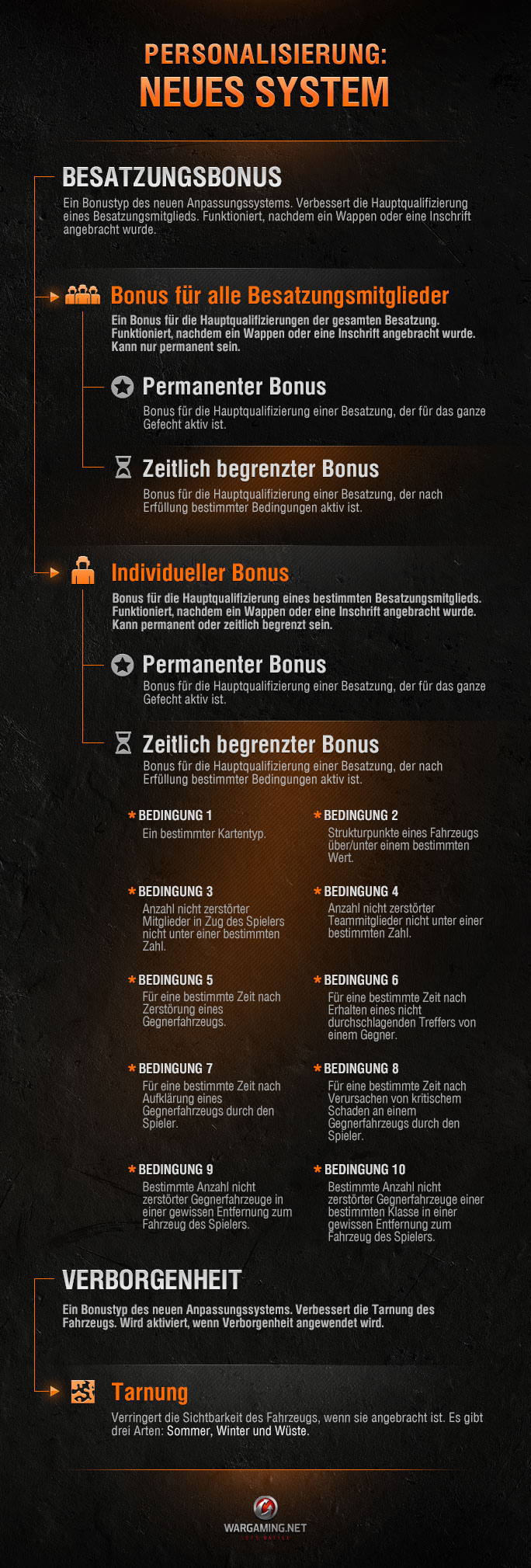 Wichtig! Alle Embleme und Schriftzüge, die Fahrzeugen angewandt wurden, bleiben bestehen. Darüber hinaus funktionieren die Boni auf Hauptspezialisierungen der Besatzung ungeachtet dessen, ob das Fahrzeug vor oder nach dem Update mit den Schriftzügen oder Emblemen versehen wurde.