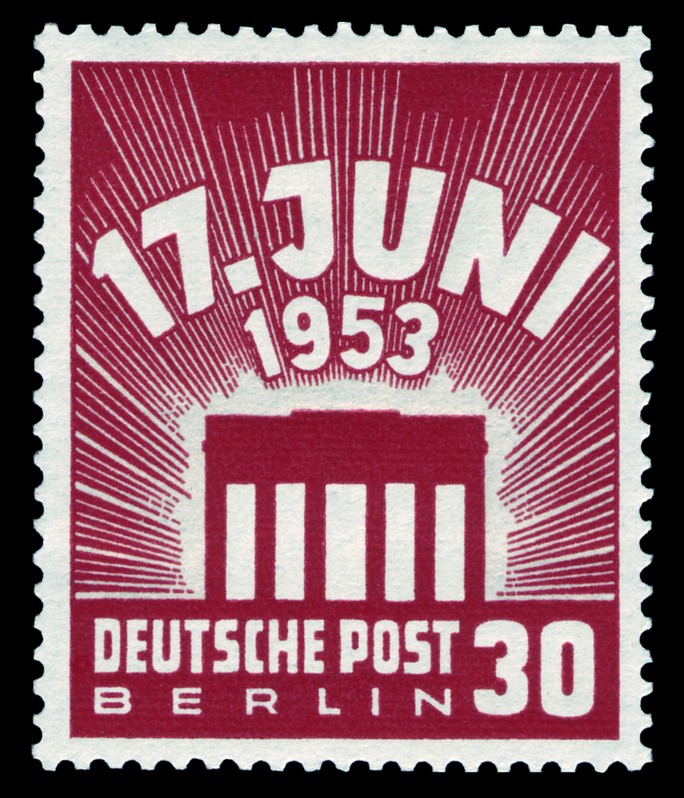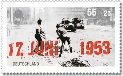 | Gedenkbriefmarken zu Ehren des 17. Juni. Auf dem linken Bild werfen Jugendliche Steine auf sowjetische Panzer. | ||