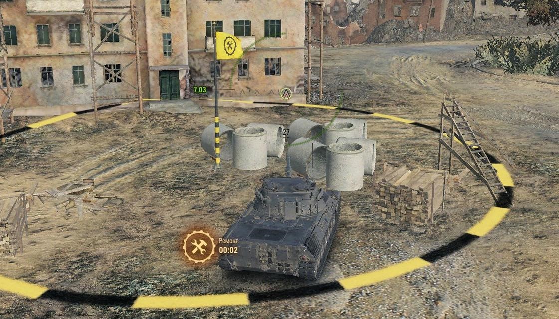 On the map there will be a number of zones to repair a vehicle and replenish ammunition. To activate these zones, simply enter the yellow circle, marked on the mini-map with the corresponding icon. Zones need to recharge after use, so pay attention to the actions of your comrades!