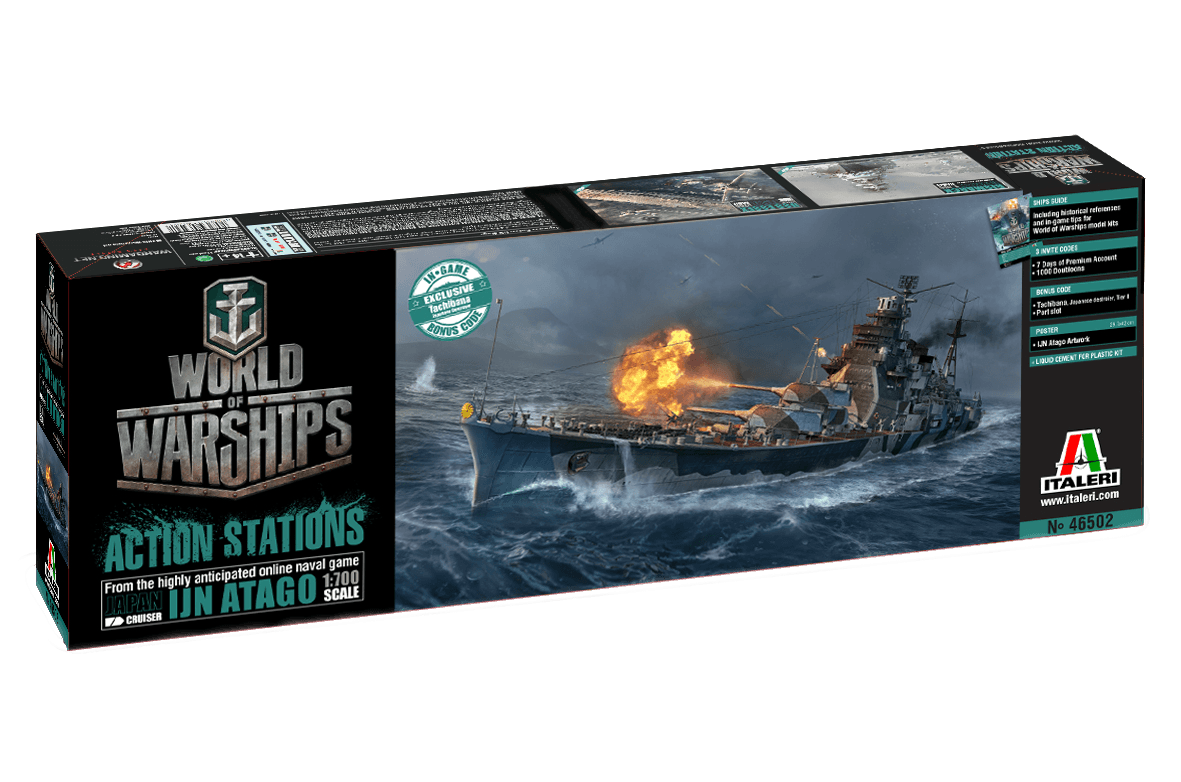 Each ship model kit (scale 1:700) comes with a ship guide including historical references and in-game tips, a liquid cement for plastics kit, in-game bonus and invite codes, and a blueprint wall poster.