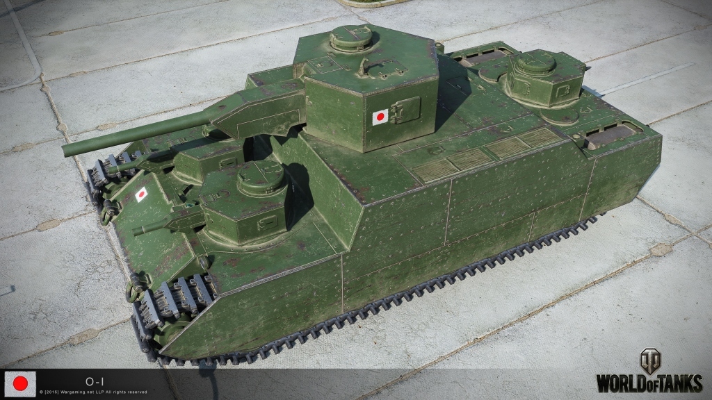 A Japanese prototype of a super-heavy tank. Like its predecessors, it is well-armoured but slow, with two guns to choose from. Use the same tactics as with the O-I. Watch out, this tank has two big turrets on the front of the tank, which limit the frontal gun depression, so keep this in mind if you try to shoot while hiding the hull behind a hill. |