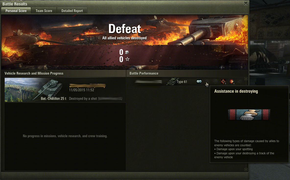 Poškoďte libovolné objevené vozidlo střelou nebo nárazem. Poškození modulu nebo ohněm se nepočítá. Střely naslepo se také nepočítají. |