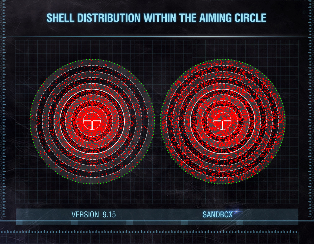 The goal is to decrease the effective firing distance, in order to increase vehicle survivability when being focused from far distances. Players will now have to aim their shots more carefully. The distribution comparison between Update 9.15 and the Sandbox is as follows:
