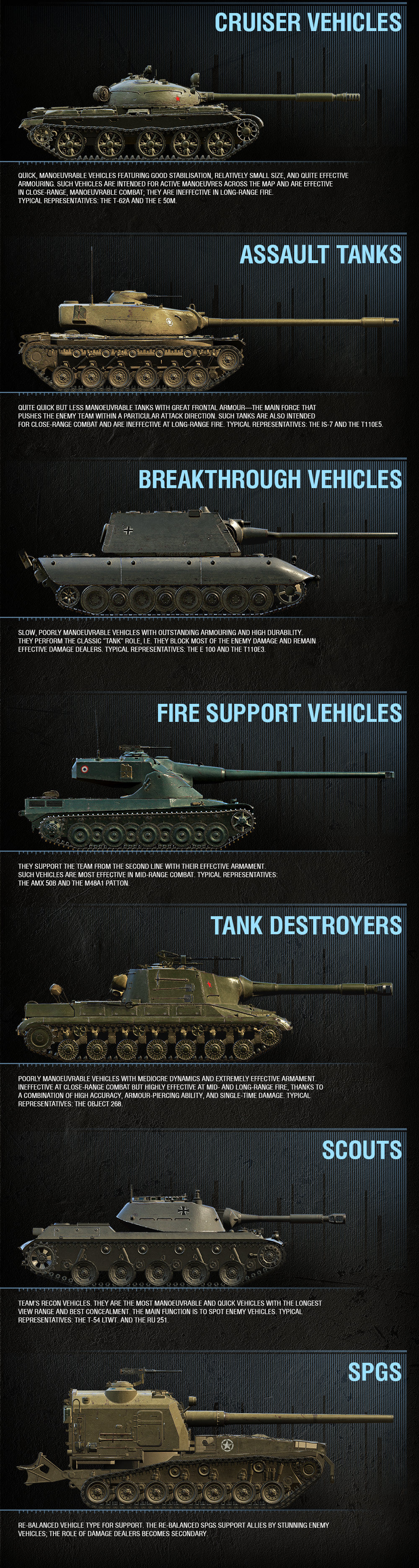 Currently, all vehicle types can perform different roles. I.e., vehicles of each type (except for SPGs and some light tanks) can perform multiple roles effectively. Thus, players use similar tactics when driving different types of vehicles, which makes the gameplay monotonous. The improvements listed below are supposed to diversify the vehicles in the game, according to their roles, and depending on the functions they perform. Seven in-game archetype roles have been distinguished on the basis of expert evaluation. These are the in-game roles that each vehicle should perform: