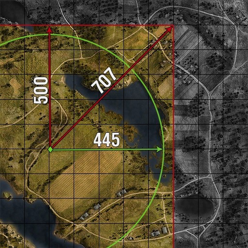 As you can see on the image, the diagonal draw distance exceeds the straight-ahead draw distance by 207 m. This setup was required by specific features of the game engine. However, in Version 9.12, the draw distance system of World of Tanks will be changed.