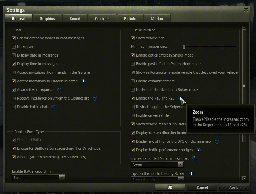 In the aim settings, there will be a new display format: a full solid circle for the Dispersion indicator with a reload indicator. Also, regardless of the chosen display format, the maximum possible zoom will be increased - now players will be able to zoom in their aim by x16 and x25. Previously the maximum zoom was up to x8. The information about the current zoom level will be displayed on the screen as well.