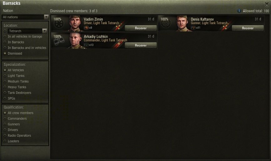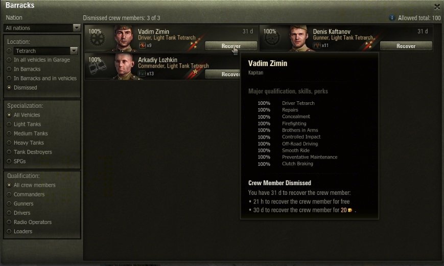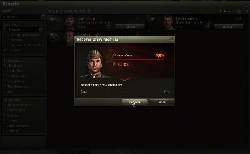 Starting with update 9.16, players will be able to restore Special or Premium vehicles and dismissed crew members right from the Garage, without any need to contact CS.