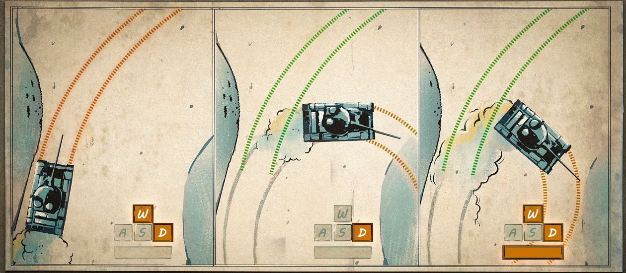 By locking one of the tracks (space bar), while driving full speed, and pressing a directional button, you can sharply change direction. This manoeuvre is perfect for escaping from enemy fire.