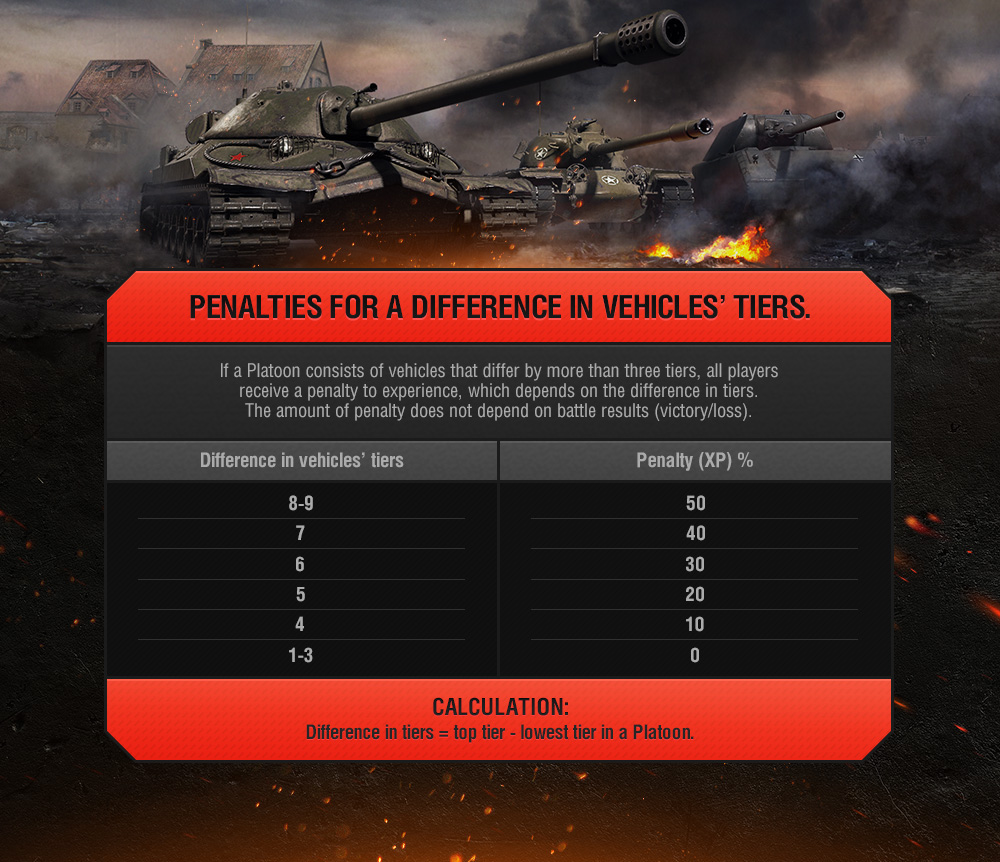 XP penalties to the result of a battle, for multi-Tier vehicles in a platoon, will be applied if the difference between the maximum and the minimum Tiers of tanks in a platoon is more than three. The XP decreasing coefficient depends on the difference in Tiers of vehicles in the platoon.