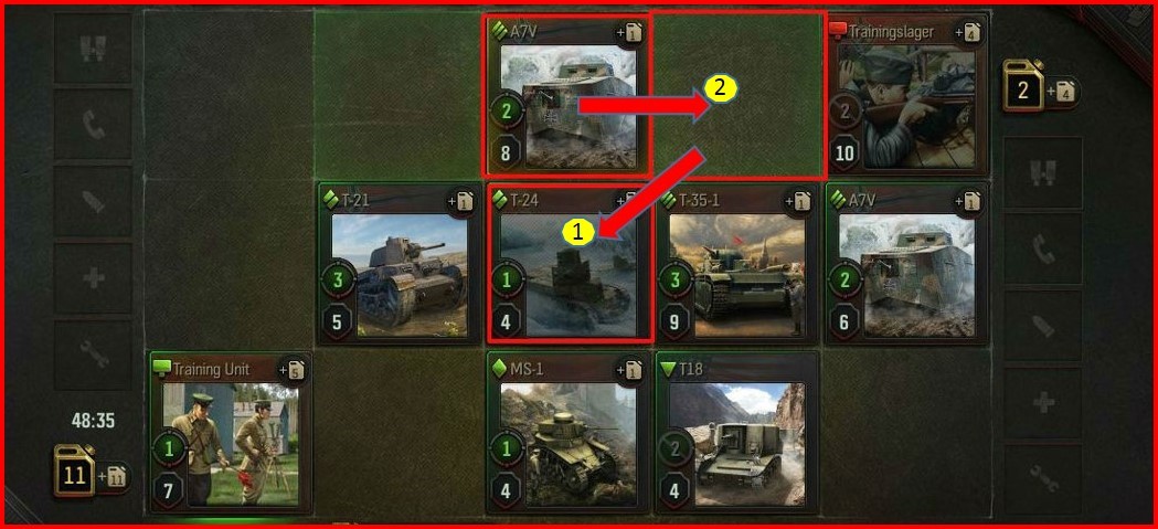 Lehký tank na níže uvedeném obrázku měl být přesunut pryč od nebezpečí - má pouze jeden zbývající život. Pokud bych s ním pohyboval, zůstal by neodhalen, ale nepřítel by mohl nasadit kartu na jeho místě. I tak se ale vyplatí udržet tuto kartu ve hře, neboť produkuje zdroje.