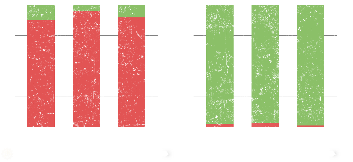 Las mejoras más destacadas se han aplicado al equilibrio de roles. Desde la actualización 2.0, hemos eliminado más del 97 % de las batallas con desequilibrio de roles que identificamos en los niveles VIII a X. Los gráficos que veréis a continuación muestran la diferencia (en rojo, las batallas con desequilibrio de roles; en verde, las batallas con equilibrio de roles):