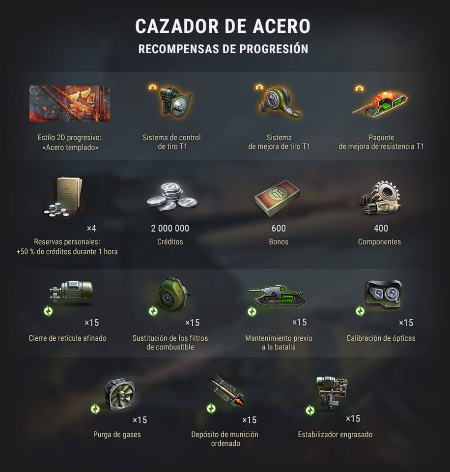 Vuelve el modo Cazador de acero del 23 al 30 de junio, lo que significa que podéis luchar para sobrevivir y por las recompensas en un mapa que se encoge progresivamente. Manejad el último carro en pie y conseguid premios increíbles, además del derecho a jactaros por vencer a los demás contendientes en la batalla por la supervivencia.