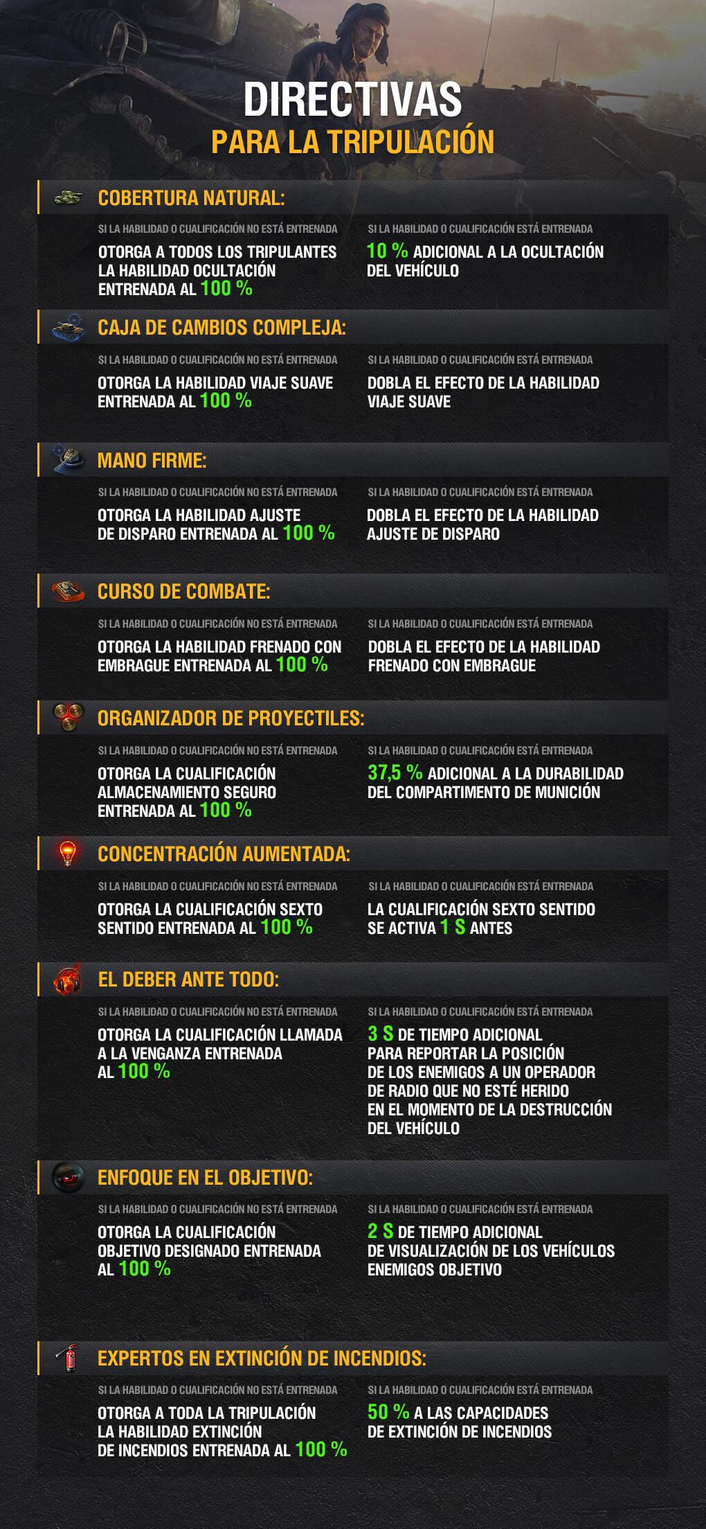 Junto al equipamiento mejorado, los bonos os pueden conseguir reservas personales especiales, llamadas directivas: seis para el equipamiento y otras nueve para la tripulación. Una vez activadas, son válidas para una batalla. Dependiendo del tipo, impulsan los parámetros de combate de un vehículo, mejoran las habilidades de la tripulación y cualificaciones que habéis entrenado o activan temporalmente aquellas que todavía no hayáis entrenado. Las directivas de equipamiento incrementan las bonificaciones que el equipamiento montado otorga a los parámetros del vehículo. Digamos que habéis equipado vuestro vehículo con barra de carga, estabilizador y ópticas recubiertas. El siguiente paso sería activar uno de los tres tipos de directivas que corresponden a estas piezas de equipamiento.