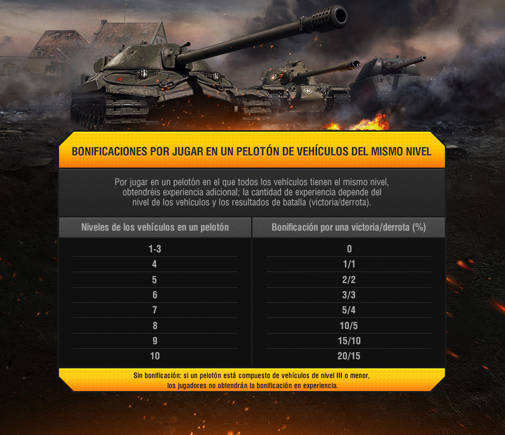 La bonificación de experiencia se otorgará a los pelotones formados por vehículos del mismo nivel. El premio dependerá del resultado de la batalla (victoria o derrota), así como del nivel de los vehículos del pelotón. Los pelotones dinámicos que se hayan creado durante una batalla obtendrán bonificaciones de experiencia por usar vehículos del mismo nivel a partir de la siguiente batalla que libren juntos. Si un jugador se incorpora a un pelotón ya creado, recibirá una bonificación de experiencia a partir de la siguiente batalla, siempre que se cumplan los requisitos establecidos.