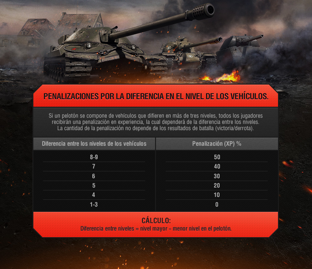 Si un vehículo se incorpora a un pelotón con vehículos de niveles dispares durante una batalla, se aplicará una penalización tras la primera batalla únicamente a los jugadores que hayan formado el pelotón de niveles dispares en el hangar.