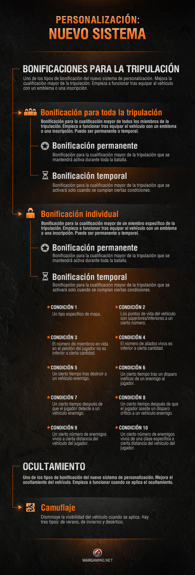 Cada emblema o inscripción con los que se equipe un carro incorporan una bonificación específica para las competencias básicas. Las bonificaciones para todos los miembros de la tripulación afectan a toda la tripulación y, dependiendo de las condiciones para su activación, pueden aumentar la competencia básica de toda la tripulación en un 1 % (bonificación permanente) o en un 2 % (bonificación temporal). Las bonificaciones individuales funcionan de una forma similar: 2 % adicional para las bonificaciones que se activen de forma permanente y un 3 % adicional para las bonificaciones que se activen una vez que se reúnan una serie de condiciones en la batalla. Las bonificaciones que se activen aparecerán en la pantalla, junto a la escala de nivelación de las competencias básicas.