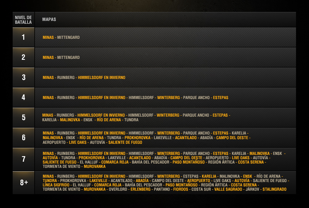 - Mapas específicos para cada nivel de batalla: El reparto de mapas determina los niveles adecuados para cada mapa. Por ejemplo, los mapas grandes no estarán disponibles para las batallas de niveles bajos y viceversa.