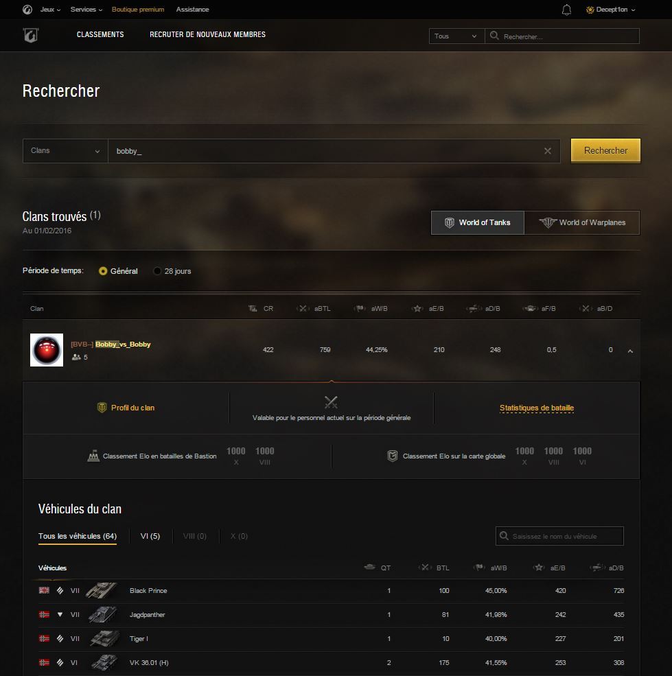 Vous pouvez maintenant rechercher un clan soit par son tag, soit par son nom : au moins deux caractères sont nécessaires pour lancer la recherche et afficher les clans correspondants, ainsi que leurs principales statistiques de batailles depuis le début ou sur les 28 derniers jours. Cliquez sur un clan dans la liste pour voir encore plus de détails à son sujet. Si vous cherchez un clan à rejoindre, choisissez un clan que vous aimez dans la liste, écrivez un bref message et envoyez votre candidature au clan.
