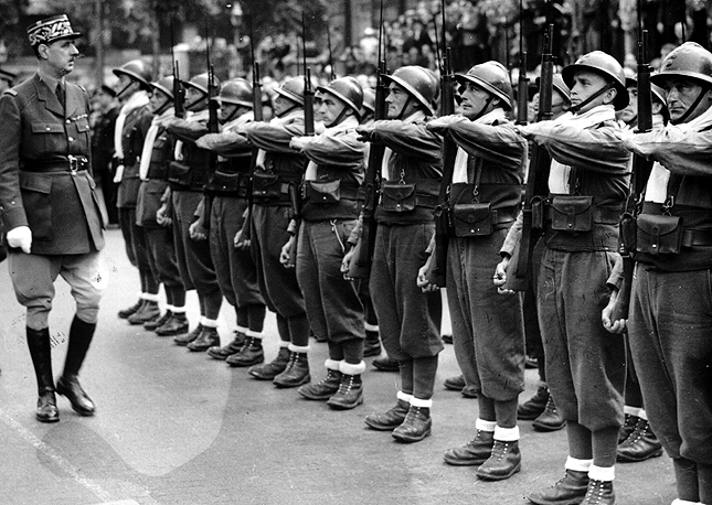 ![]() Charles de Gaulle passant en revue les premiers hommes des Forces Françaises Libres à Londres le 14 juillet 1940 - Source : www.charles-de-gaulle.org/