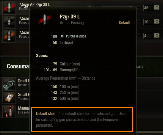 - Ammunition. The default type will be marked in a tooltip on the shell. And you can see it compared to others, right in the tooltip, which will make it a lot easier to choose the most useful shell for the job. By the way, these newly added tooltips aren’t just for vehicle comparison. They are just a small fragment of the improvements to the simplified technical characteristics display that will make its way into the game in the next update.