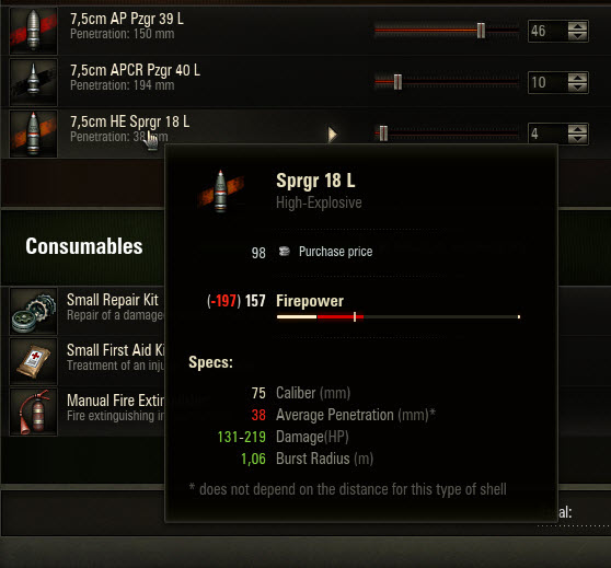 - Ammo type representation will get a slight revamp a well. Just as in the vehicle comparison screen, the default type will be underlined in a tooltip, while others will be compared to it right there.