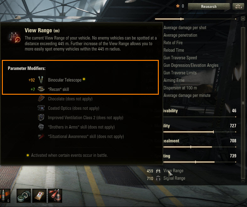 - Consumables and equipment. With these you can choose any item from the list. To keep things simple, we highlighted those that don’t affect technical parameters with an exclamation mark (“!”). Keep in mind that any consumable or equipment adds to the vehicle’s overall weight and might slightly reduce its mobility.