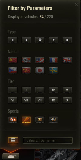 The confusing “Reset Filters” button (often mixed up with “Apply Filters”) will soon be replaced with a far more useful search bar. Here, you can search by name, taking into consideration all the filters marked earlier, e.g., if you select, heavy USSR tanks, it’ll search among them. If you’d like to search among absolutely all vehicles, don’t apply any filters. Just type the name to get a full list of all available vehicles whose name(s) contains the characters you typed in the search field.