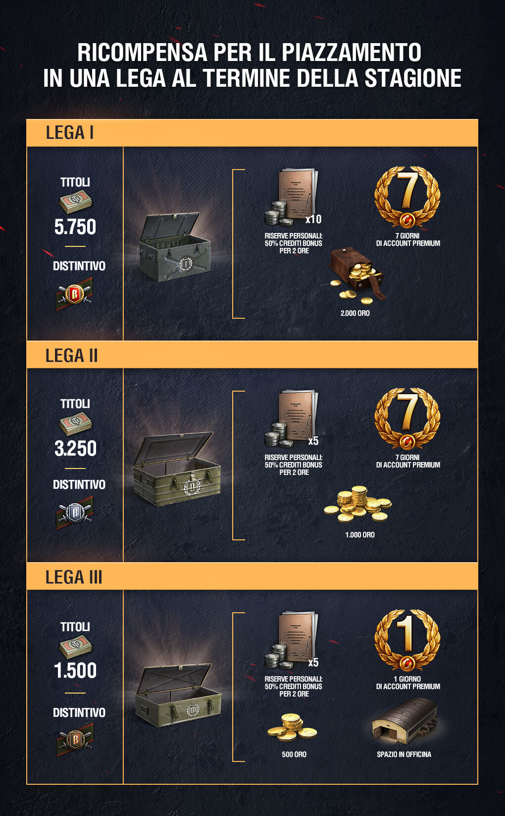All’inizio di una nuova fase, il rango raggiunto verrà azzerato, mentre i punti rango verranno mantenuti fino al termine della stagione. Questo significa che la barriera d’ingresso nella lista dei leader della stagione si alzerà dopo ogni fase e avrai bisogno di stare al passo per tutta la stagione per rimanerci. Da qui, il tuo obiettivo finale è di raggiungere il 50% dei migliori Leader della stagione e di rimanere tra essi fino al termine della stagione. Ciò ti ricompenserà con un posto tra le tre leghe a premio, un buon ammontare di titoli e un distintivo esclusivo (di tre tipi, in base alla lega) a simbolo della tua maestria. Quest’ultimi sono mostrati in officina e di fianco al tuo nome in tutte le battaglie per darti sfoggio.