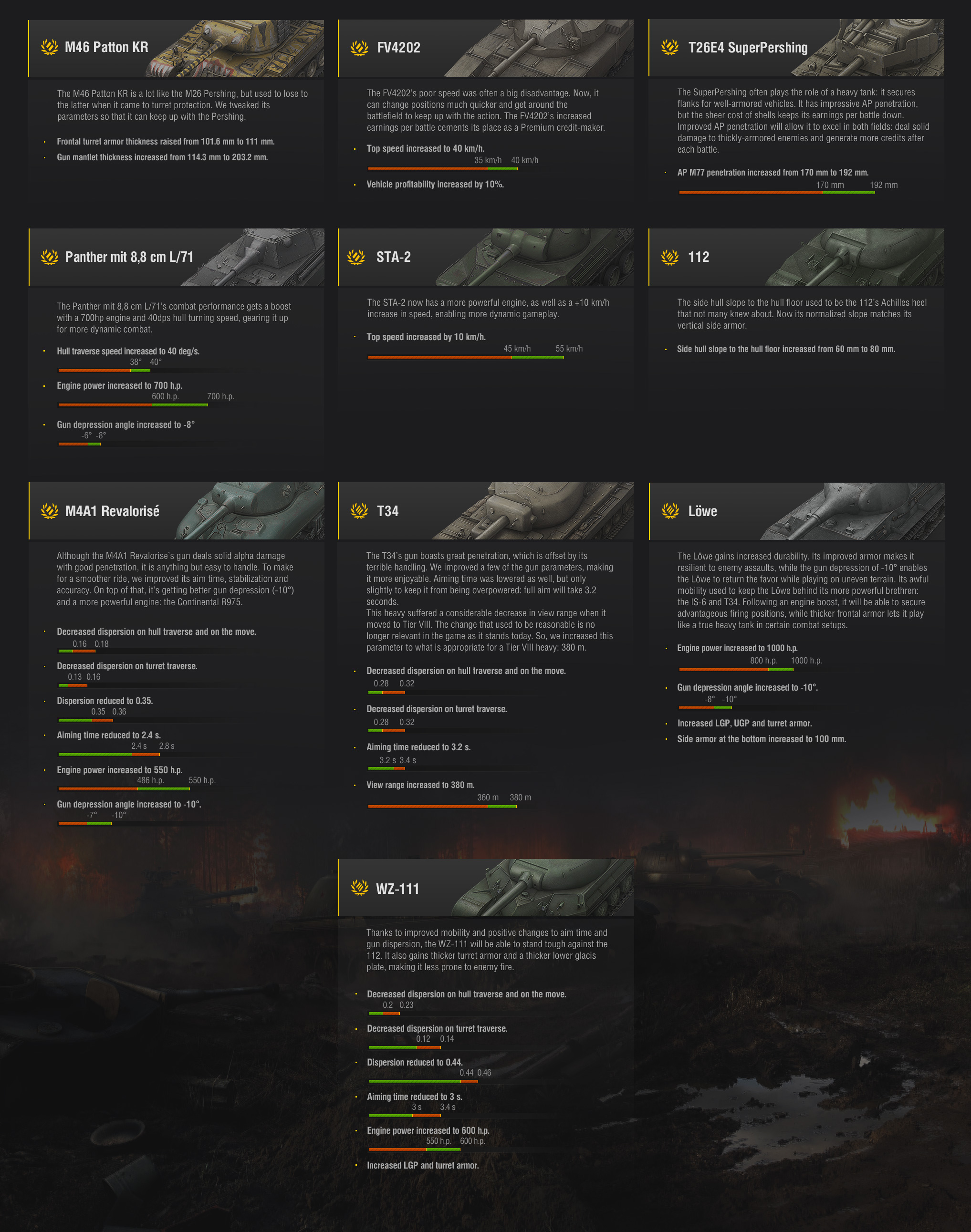 Thanks to your feedback, we’ve built on the first round of changes to several Premium vehicles, tweaking the combat parameters of the FV4202, STA-2, M4A1 Revalorisé, T26E4 SuperPershing, WZ-111, Löwe, Panther 8.8, T34, M46 Patton KR, and 112.