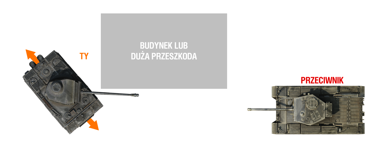 Ważne: Gdy wyskakujecie zza rogu, upewnijcie się, że Wasz kadłub jest ustawiony pod odpowiednim kątem i że nie wystawiacie na strzał koła napędowego. Dzięki temu zredukujecie szansę na przebicie kadłuba, a także unieruchomienie Waszego czołgu (co uniemożliwi Wam wycofanie się), gdyby przeciwnikowi udało się jednak odpowiedzieć ogniem. Jeśli zostaniecie unieruchomieni w wąskim przejściu, możecie mieć naprawdę duże kłopoty.