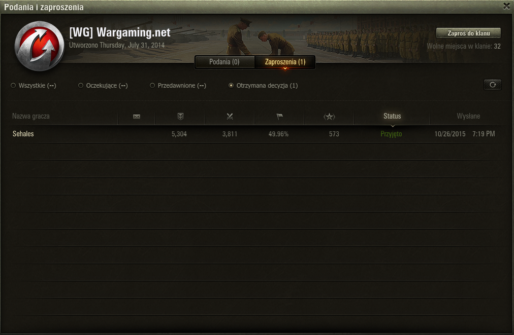 Zgłoszenie się do nowego klanu zabiera teraz mniej czasu niż wyposażenie czołgu przed bitwą! W powiadomieniach zobaczycie otrzymane zaproszenia. Dołączycie do klanu po kliknięciu przycisku „Przyjmij”. Możecie też najpierw przejrzeć informacje o nim i dopiero wtedy zdecydować o przyjęciu zaproszenia.