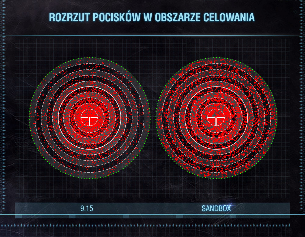 Zmiany mają na celu zmniejszenie zasięgu skutecznego ostrzału, dzięki czemu pojazdy ostrzeliwane z dużej odległości będą miały większą szansę na przetrwanie. Gracze będą musieli staranniej celować przy każdym strzale. Poniżej przedstawiono porównanie rozkładu trafień w wersji 9.15 i w Piaskownicy: