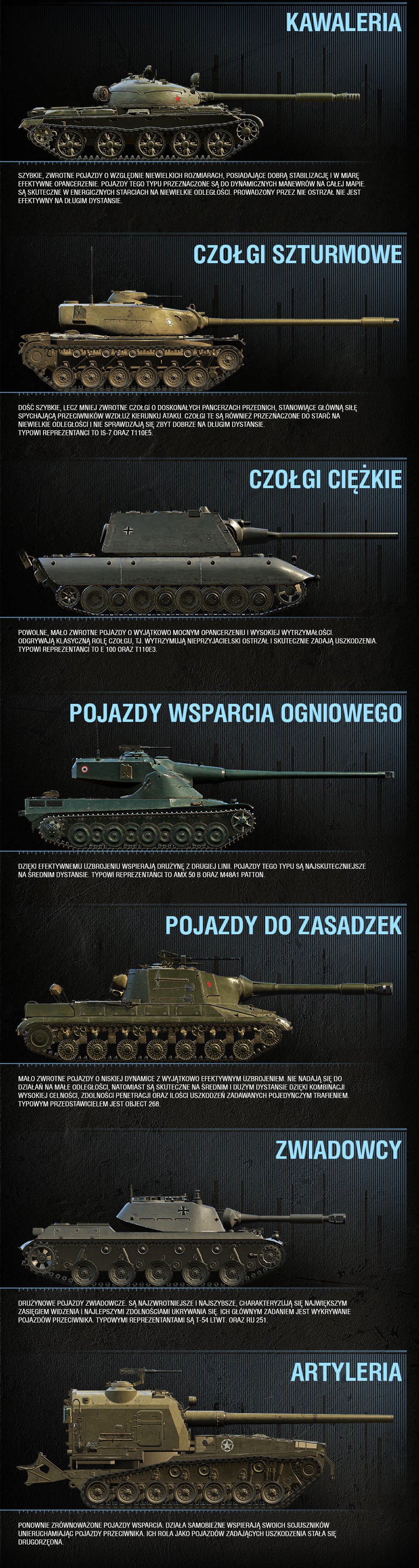 Obecnie każdy typ pojazdu może pełnić różnorodne funkcje. Oznacza to, że pojazdy każdego typu (poza działami samobieżnymi i czołgami lekkimi) mogą skutecznie odgrywać wiele ról. Z tego powodu gracze korzystają z podobnych taktyk niezależnie od typu pojazdu, przez co rozgrywka staje się monotonna. Poniższe usprawnienia mają na celu urozmaicenie pojazdów w grze pod względem odgrywanych ról, które będą zależały od wykonywanych funkcji. Na podstawie uwag ekspertów wyznaczyliśmy siedem archetypów w grze. Stanowią one role, które powinny być odgrywane przez poszczególne pojazdy w grze.