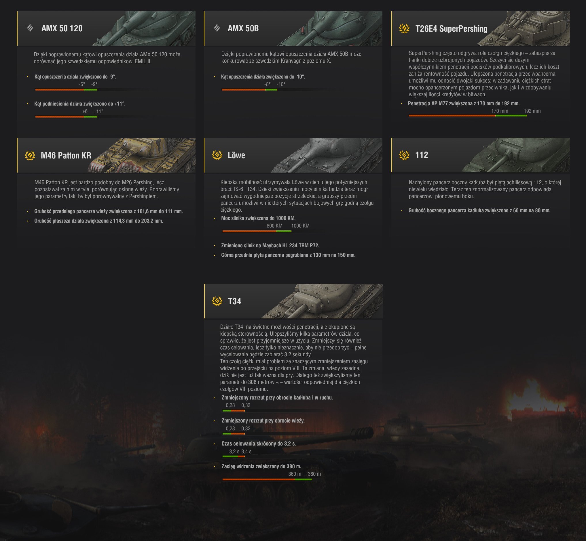 Löwe zyskał kolejne wzmocnienie – potężniejszy silnik i grubszy pancerz. Dodatkowo, zgodnie z Waszymi opiniami, ulepszyliśmy parametry jeszcze czterech pojazdów premium: amerykańskich T34, T26E4 SuperPershing i M46 Patton KR oraz chińskiego 112, jak również dwóch francuskich czołgów ciężkich: AMX 50 B oraz AMX 50 120. Kliknijcie poniższy obrazek, aby zobaczyć szczegółowe zestawienie.