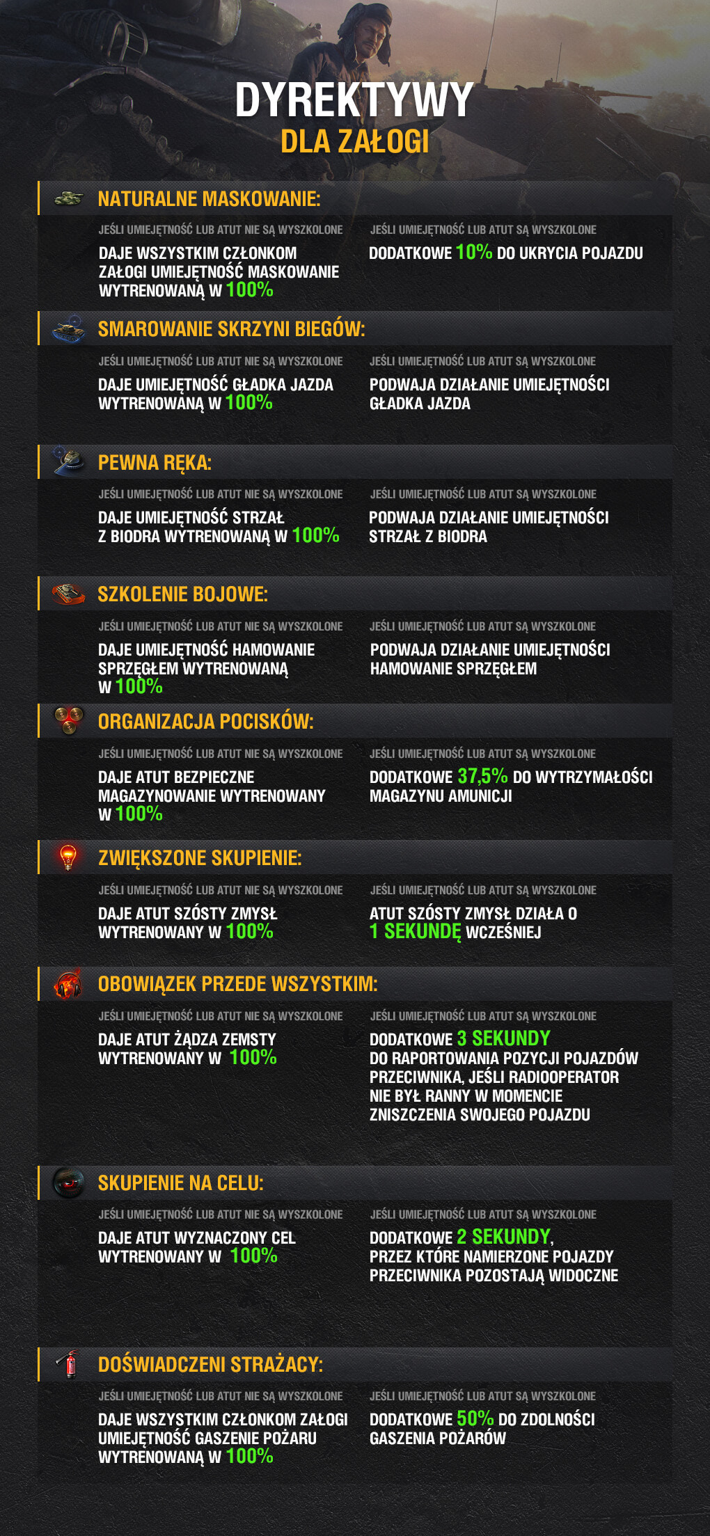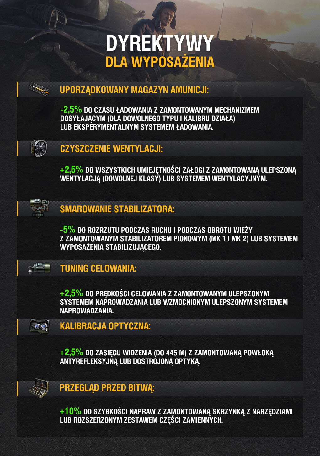 Oprócz ulepszonego wyposażenia za obligacje można kupić specjalne rezerwy osobiste zwane dyrektywami: sześć dla wyposażenia i dziewięć dla załogi. Po aktywowaniu wystarczają na jedną bitwę. W zależności od rodzaju poprawiają właściwości bojowe pojazdu, polepszają wyszkolone umiejętności i atuty załogi lub uruchamiają te, które nie zostały wyszkolone. Dyrektywy wyposażenia zwiększają premię otrzymywaną za aktualnie zamontowane wyposażenie. Powiedzmy, że macie na wyposażeniu Mechanizm dosyłający, Stabilizator i Powłokę antyrefleksyjną. Kolejnym krokiem będzie aktywowanie jednej z trzech dyrektyw współdziałających z tymi typami wyposażenia.